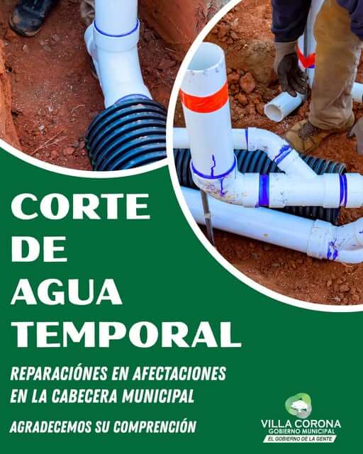 El Gobierno Municipal de Villa Corona 2024–2027 informa a la ciudadanía que, debido a la ruptura de una tubería en la zona del Oxxo, ubicada en la entrada a la cabecera municipal, será necesario realizar la suspensión temporal del servicio de agua potable.