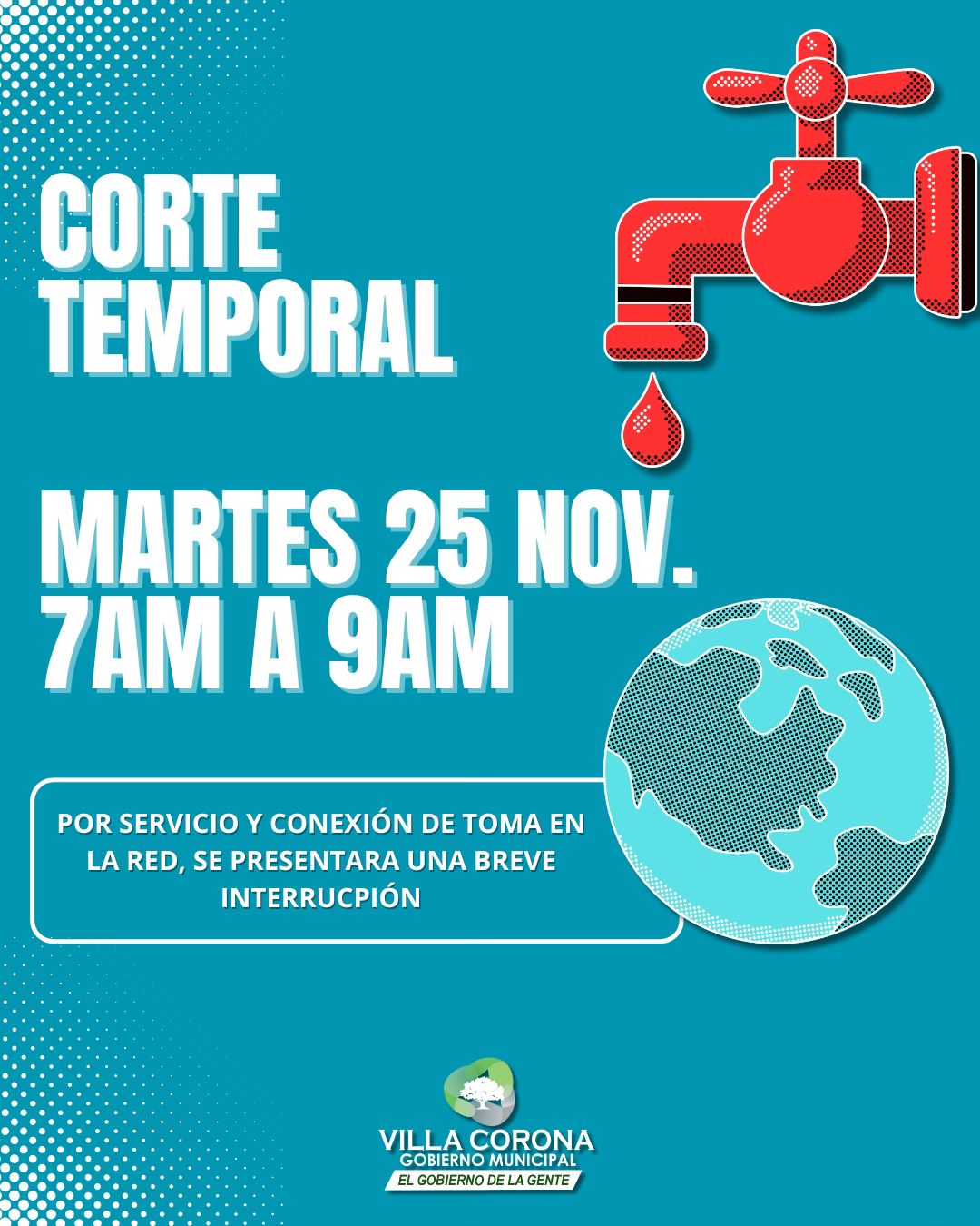 Se informa a toda la ciudadanía que este martes 25, en un horario de 7:00 a 9:00 a.m., se llevará a cabo un corte temporal en el suministro de agua potable.