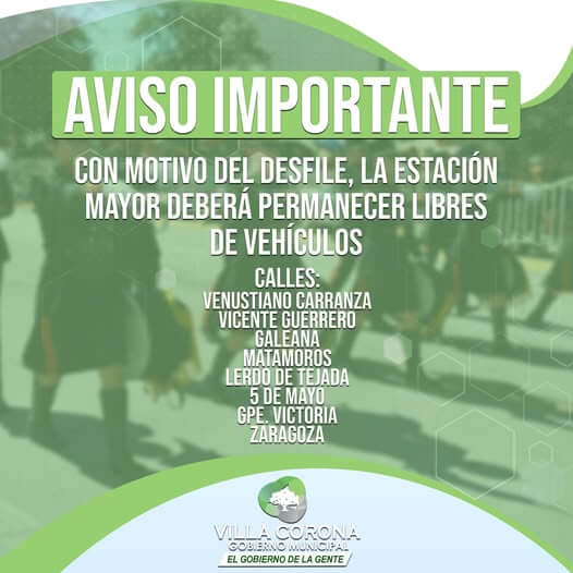 El Gobierno Municipal de Villa Corona 2024–2027 informa a la ciudadanía que, con motivo del desfile conmemorativo del 18 de marzo, se implementarán cierres viales en la zona de Estación Mayor y calles aledañas.