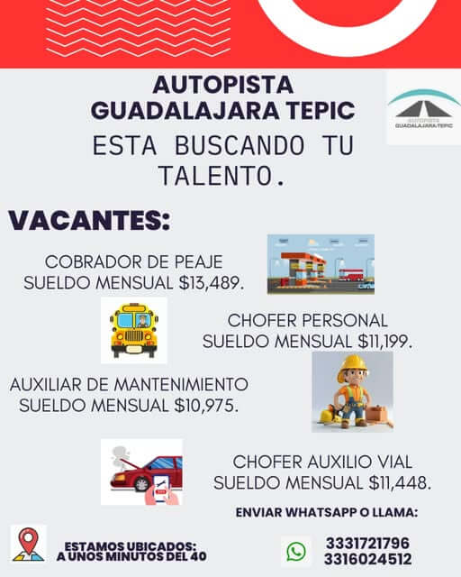 El Gobierno Municipal de Villa Corona informa a la ciudadanía sobre una oferta de empleo disponible en la Autopista Guadalajara–Tepic, específicamente en la caseta Santa Cecilia.