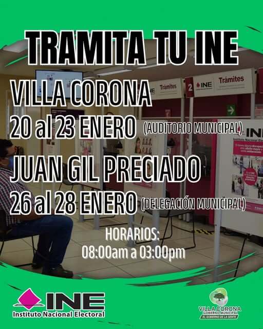 El Gobierno Municipal de Villa Corona 2024–2027 informa a la ciudadanía que durante el mes de enero se estarán llevando a cabo jornadas para tramitar o actualizar la credencial para votar (INE), con el objetivo de que las y los ciudadanos cuenten con este documento oficial vigente.
