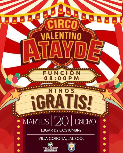 El Circo Valentino Atayde, en coordinación con el Gobierno Municipal de Villa Corona, invita a todas las niñas y niños del municipio a disfrutar de una función de circo totalmente gratuita, como parte de las acciones que promueven la sana convivencia y la recreación familiar.