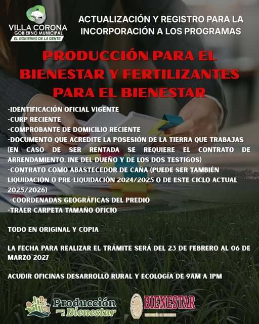 El Gobierno Municipal de Villa Corona 2024–2027, en coordinación con la Secretaría de Bienestar, invita a las y los productores de caña a realizar su actualización y registro para la incorporación a los programas: