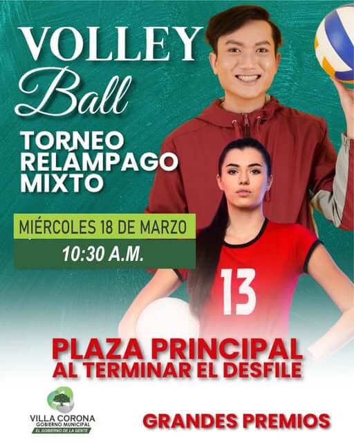 El Gobierno Municipal de Villa Corona 2024–2027 invita a la ciudadanía a participar en el Torneo Mixto de Voleibol Relámpago, una actividad deportiva que busca fomentar la convivencia, el trabajo en equipo y la activación física en un ambiente familiar.