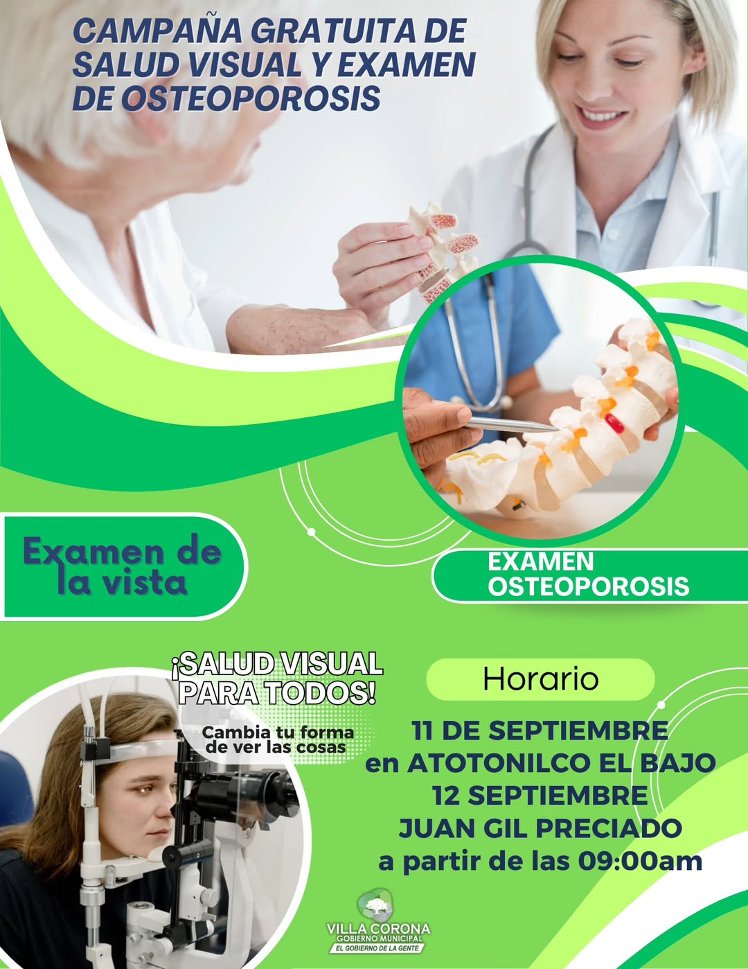 La salud es lo primero, y queremos que todos los habitantes de Villa Corona puedan revisarse y cuidarse. Por eso, los próximos 11 y 12 de septiembre se realizarán exámenes gratuitos de vista y osteoporosis en dos puntos de nuestro municipio.