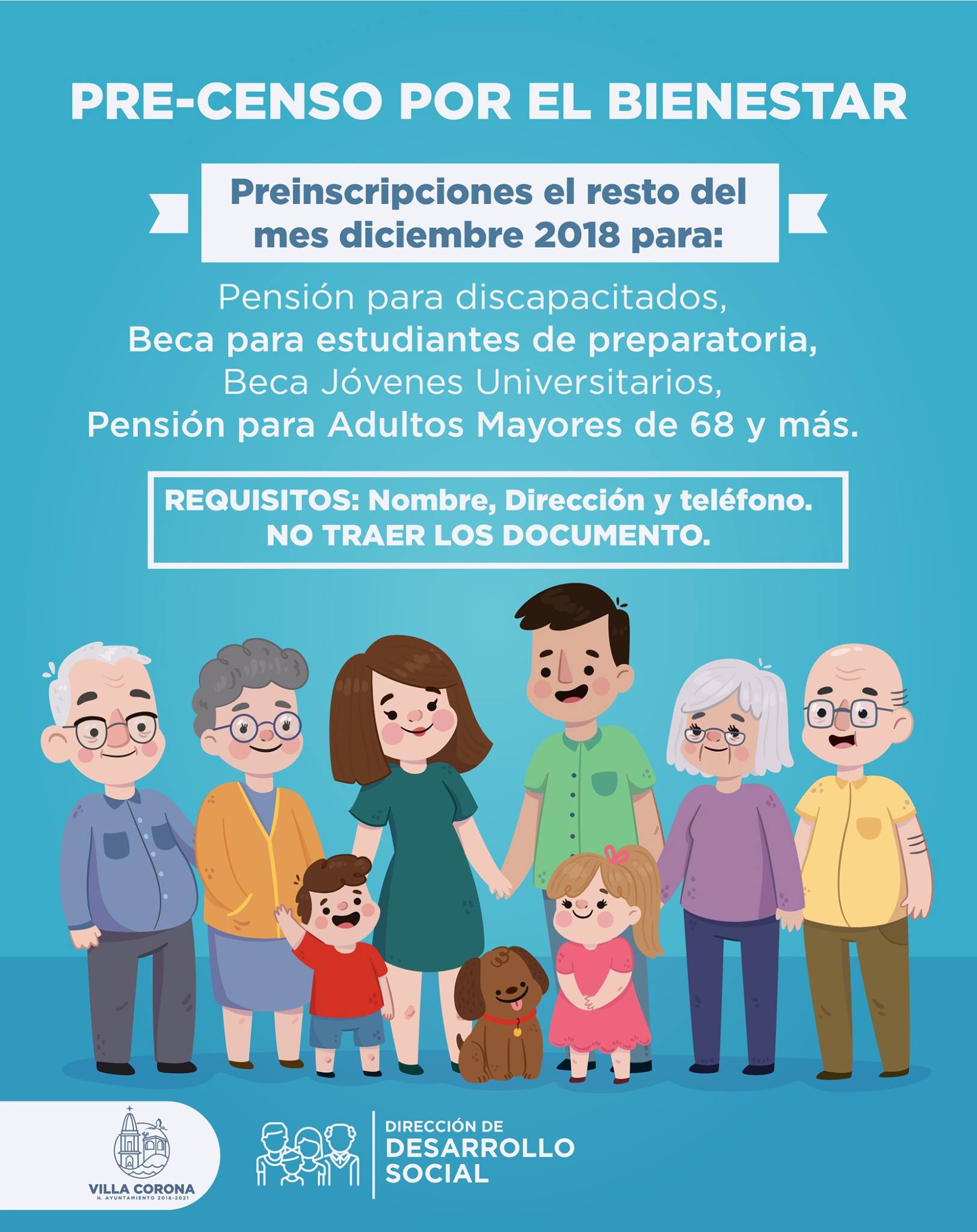 EL ayuntamiento de Villa Corona y la dirección de Desarrollo Social en conjunto con el Gobierno Federal, estará realizando preinscripciones el resto del mes de diciembre para los programas federales prioritarios, para que posteriormente personas encargadas de realizar el “Censo por el bienestar” pasen a su domicilio.