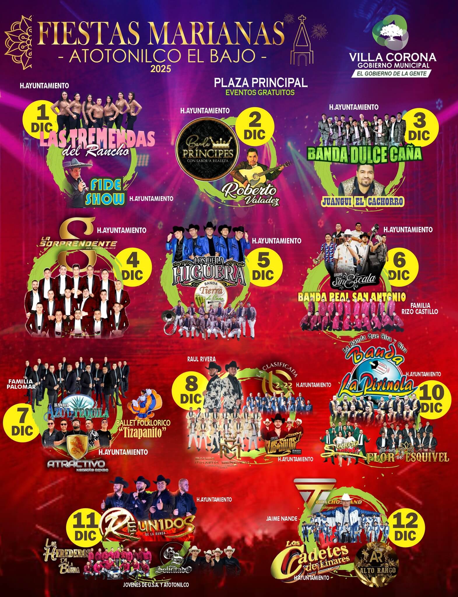 El Gobierno Municipal de Villa Corona informa a la ciudadanía sobre el programa oficial de las Fiestas Marianas en Atotonilco el Bajo, que se llevarán a cabo del 1 al 12 de diciembre.