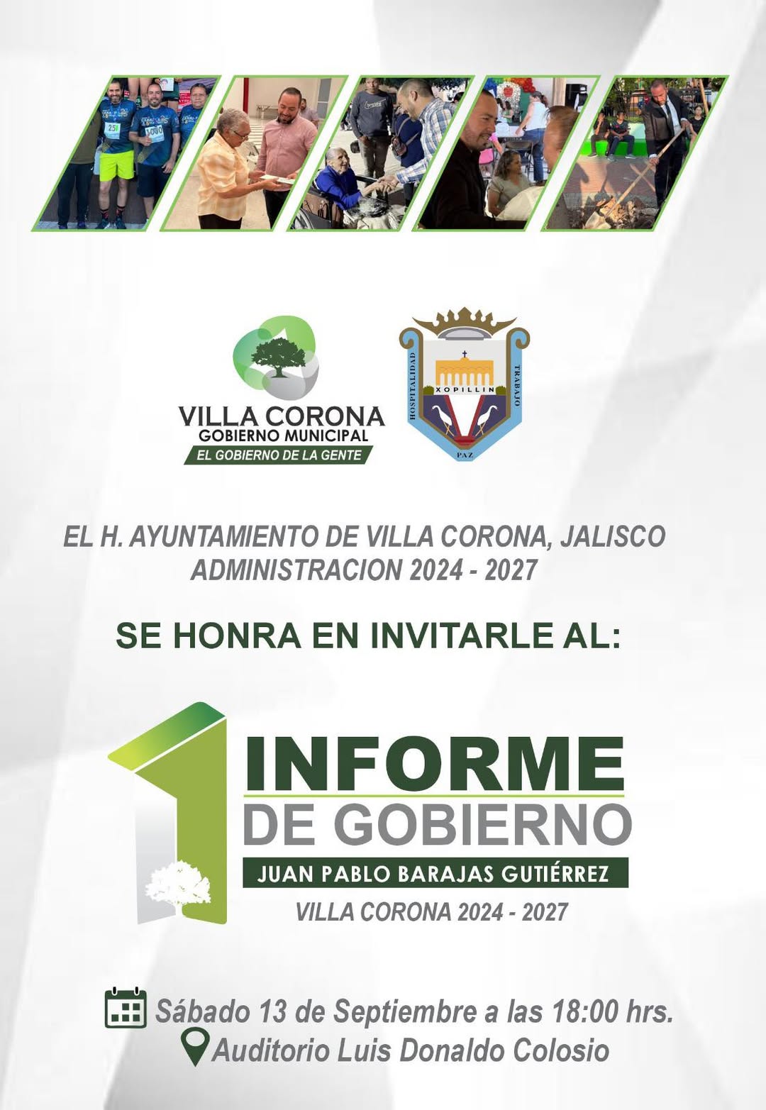 El H. Ayuntamiento de Villa Corona, Jalisco, Administración 2024-2027, se honra en invitarte al Primer Informe de Gobierno del Presidente Municipal Juan Pablo Barajas Gutiérrez.