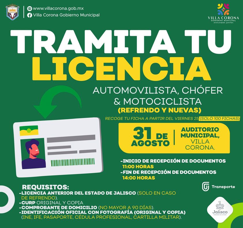 Regresa el trámite de licencias de Automovilista, Chófer y Motociclista (Nueva y refrendo) en Villa Corona.