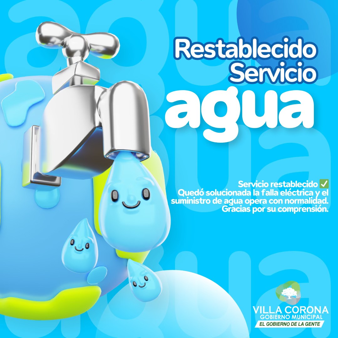 Se informa a la ciudadanía que el servicio de agua potable ha quedado restablecido en su totalidad, luego de que se solucionara la falla en el suministro de energía eléctrica que afectaba el funcionamiento de los equipos de bombeo.
