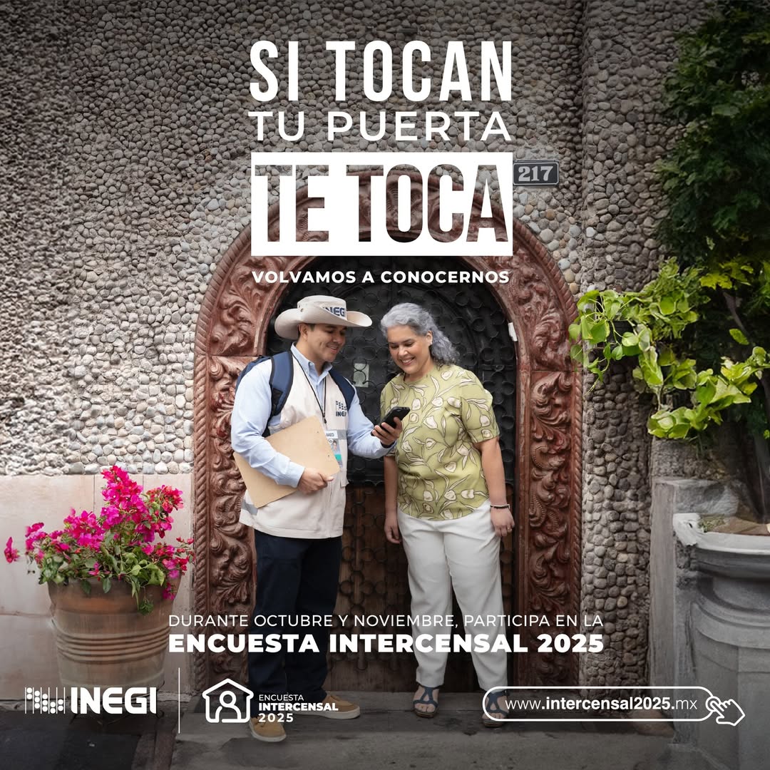 ¡Ya inició la Encuesta Intercensal #EIC2025! Si las personas entrevistadoras del #INEGI tocan tu puerta, te toca ¡participa! 🔗 Entra a www.intercensal2025.mx y conoce más.